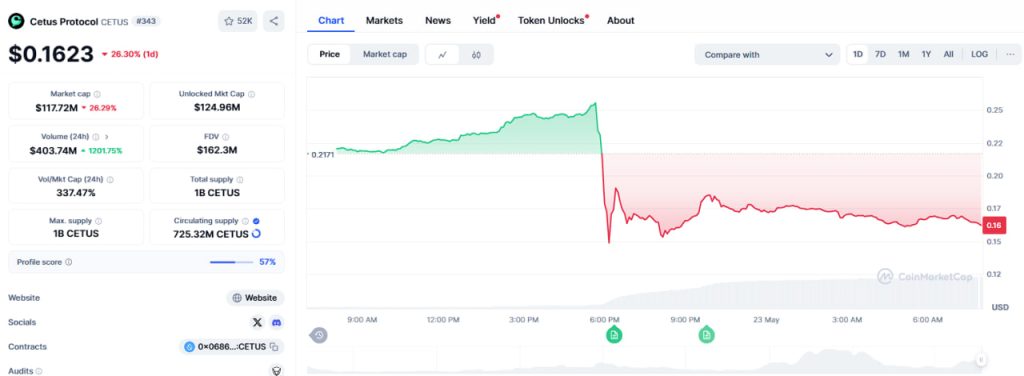 The CETUS token price has dropped nearly 20% in 24 hours, currently trading around $0.1623 after falling from $0.25. The market capitalization is $117.72 million, while the 24-hour trading volume has increased by 1,026% to $196.75 million. CETUS is traded on Cetus, Binance, OKX, Bitget, Gate.io, and many other exchanges.