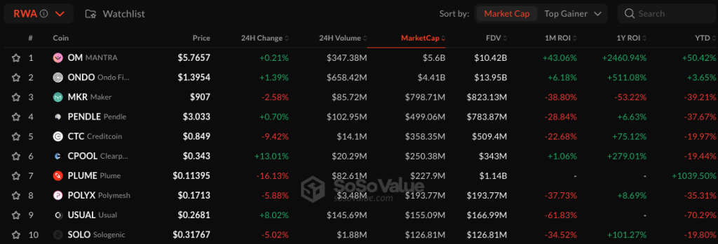 Top Real-World Asset (RWA) Cryptos Ranked by Market Cap. Source: SoSoValue