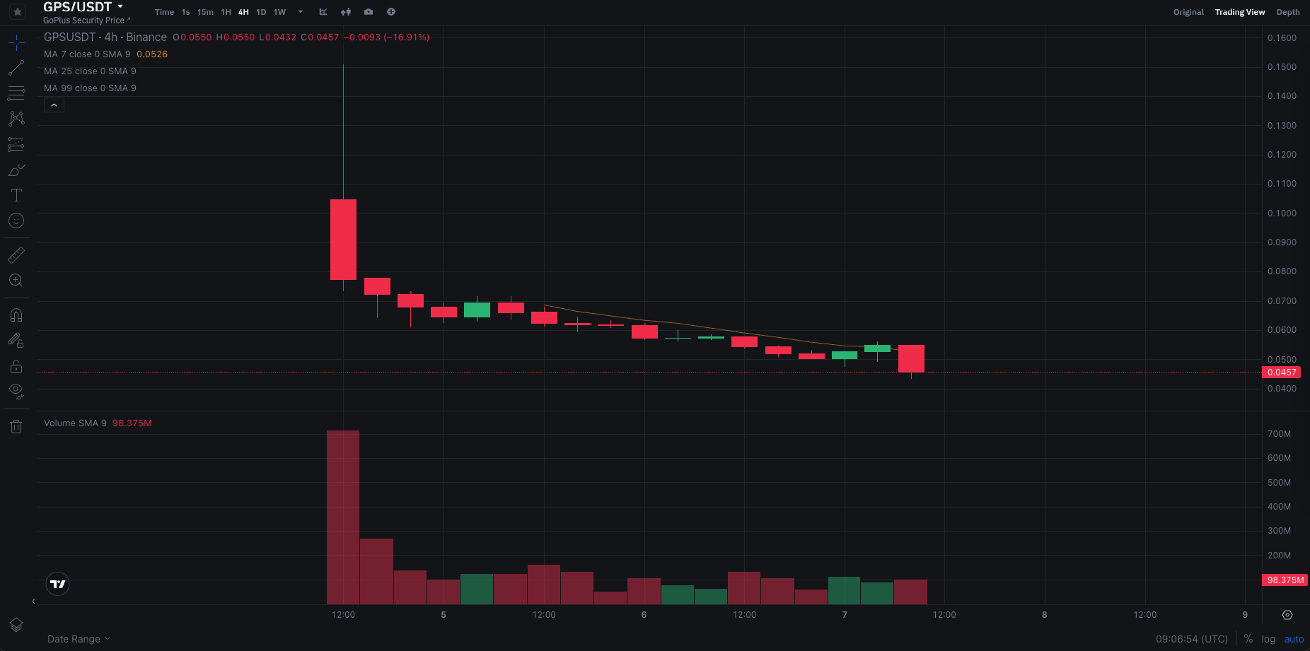 The price of GPS/USDT on Binance has witnessed a sharp decline, falling 70% within just three days of its launch. Initially showing strong trading volumes, the token saw a steep selloff, dropping prices from over $0.15 to $0.0457 as of this writing.