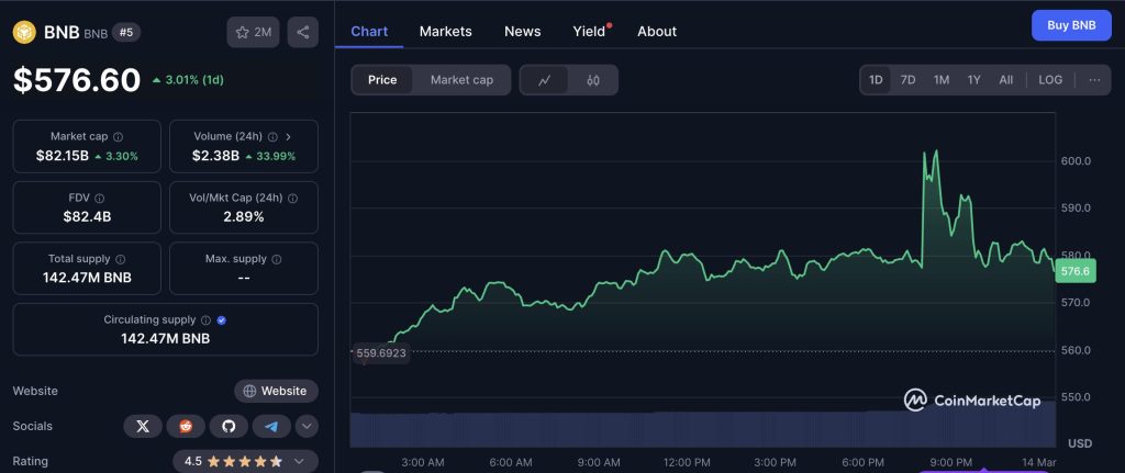 Following CZ’s confirmation, the BNB price returned to trading at around $576, similar to before the Binance news was reported by The Wall Street Journal and Bloomberg.
