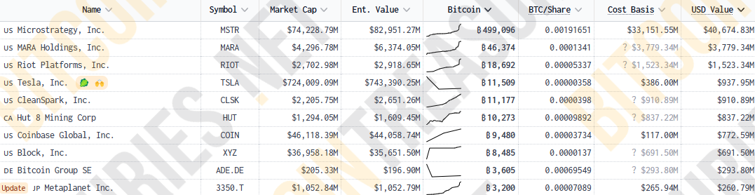 Metaplanet’s aggressive Bitcoin accumulation strategy has positioned it among the top 10 public companies holding BTC, according to data from Bitcoin Treasuries. While Strategy (formerly MicroStrategy) still dominates with 499,226 BTC, Metaplanet’s rapid acquisitions suggest a growing influence in the corporate Bitcoin space.
