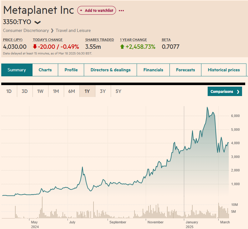 Despite a slight 0.49% dip in Metaplanet’s stock price to ¥4,030 following its latest BTC acquisition, investor sentiment remains strong. The company’s stock has surged 15.8% year-to-date and skyrocketed 2,458% over the past year, reflecting growing market confidence in its Bitcoin-first strategy.