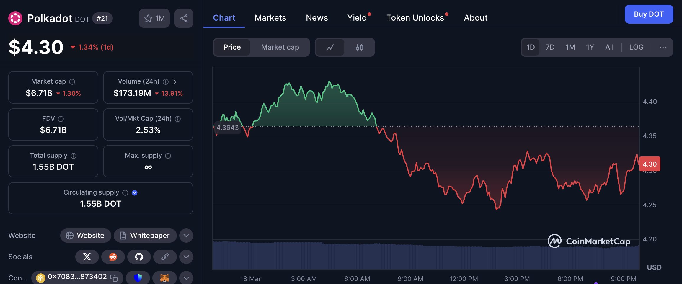 The 21Shares Polkadot ETF is designed to track the spot price of Polkadot’s DOT token, currently the 21st largest cryptocurrency by market capitalization. DOT is currently trading open at $4.3 at the time of writing.