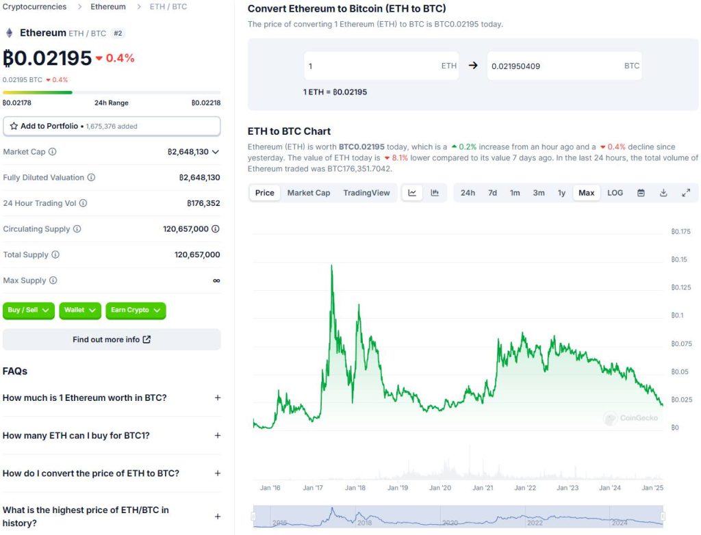 | Key Points: – ETH/BTC Ratio has dropped to its lowest level since May 2020, reflecting Ethereum’s significant underperformance against Bitcoin in 2025. – Ethereum has declined 39% against Bitcoin year-to-date, failing to capitalize on post-halving market trends. – Solana (SOL) continues to outperform Ethereum, with the SOL/ETH Ratio up 24% despite SOL’s own market correction. – Capital is shifting away from Ethereum due to macroeconomic pressures, increasing Bitcoin dominance, and investor preference for more resilient assets. |