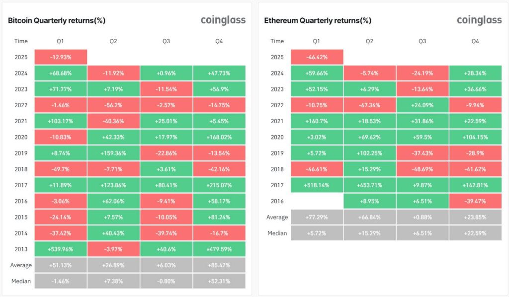 Market data from CoinGlass highlights that Q1 2025 marked Ethereum’s weakest performance against Bitcoin in years. The last comparable downturn was in Q3 2018, when the ETH/BTC Ratio collapsed to 0.0164, representing a 48% drop in one quarter.
