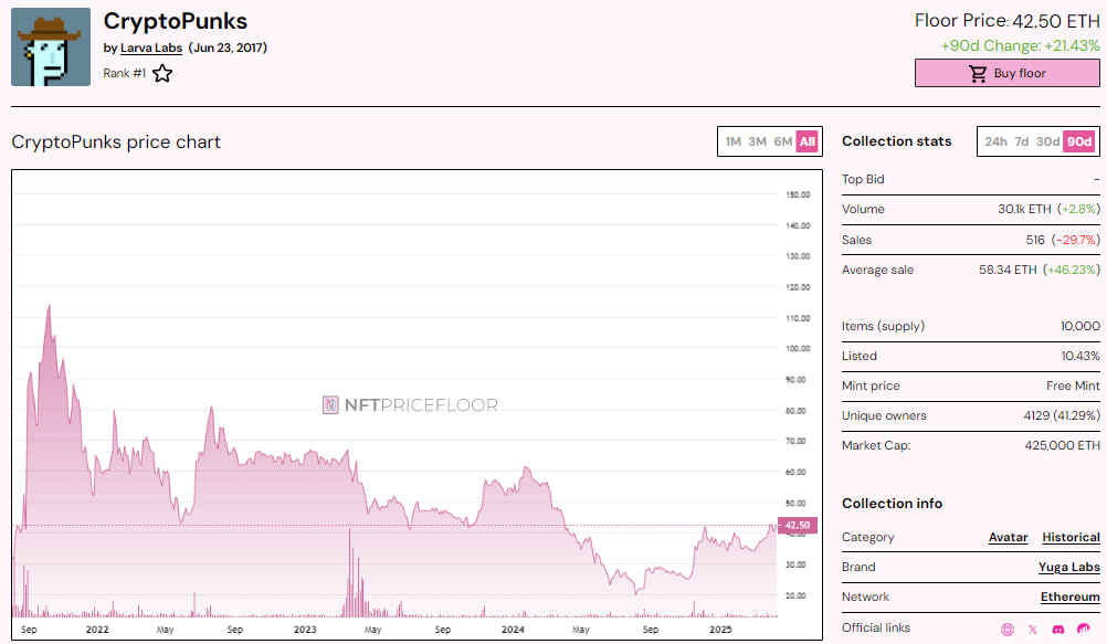 CryptoPunks, once the flagship collection of the 2021 NFT boom, has struggled to maintain its dominance. Despite Alien Punks consistently ranking among the highest on-chain sales, the broader market has cooled significantly.