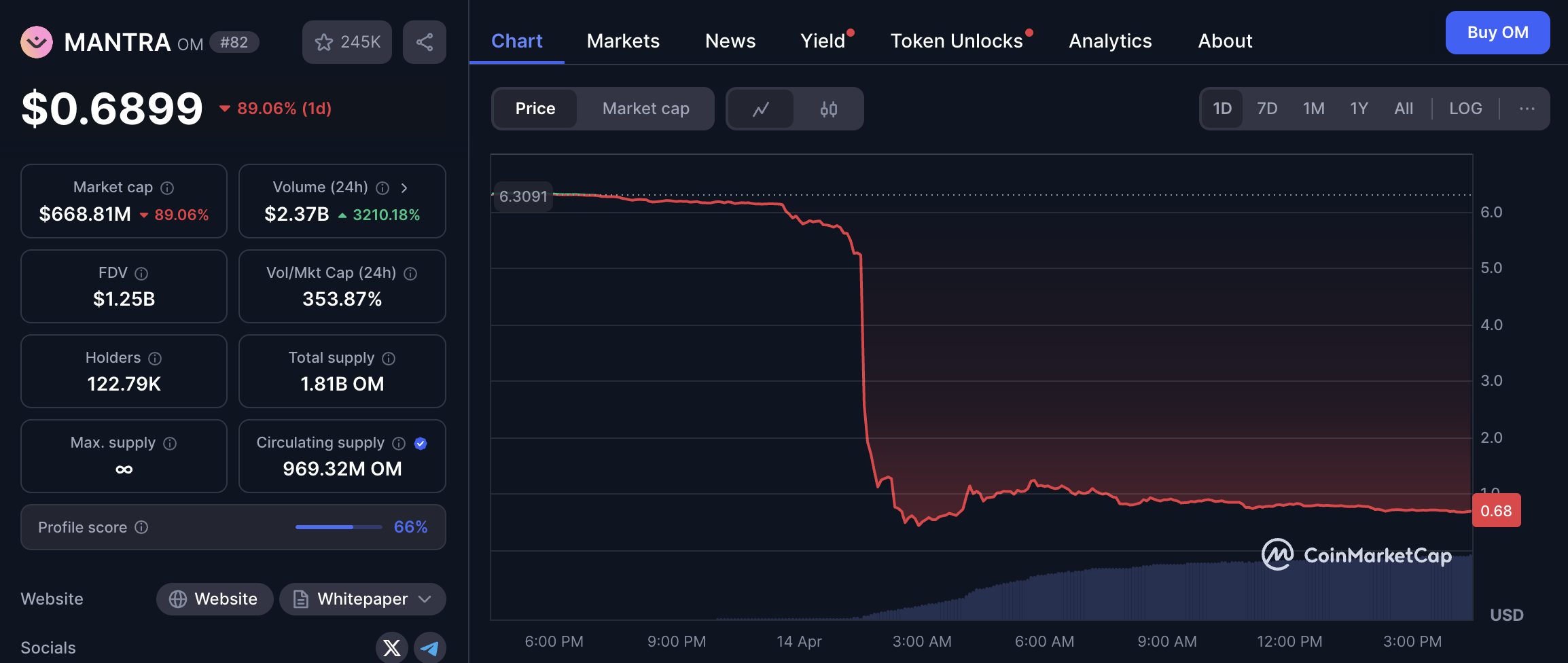 OM, the governance and transaction token of Mantra — a blockchain platform focused on tokenizing real-world assets (RWAs) like real estate and commodities — dropped from $7 to around $0.4 in a single trading window, causing substantial losses for investors and traders.