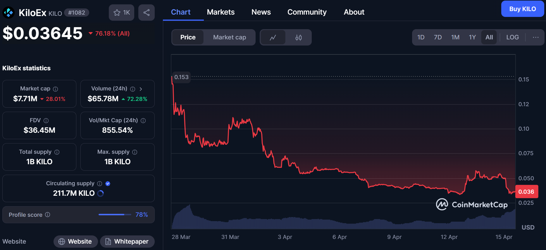The DEX KiloEx Hack had immediate market consequences. The KILO token plummeted by over 31% in 24 hours, falling to $0.036. This marks a 76% decline from its all-time high of $0.153 reached just weeks earlier on March 27.