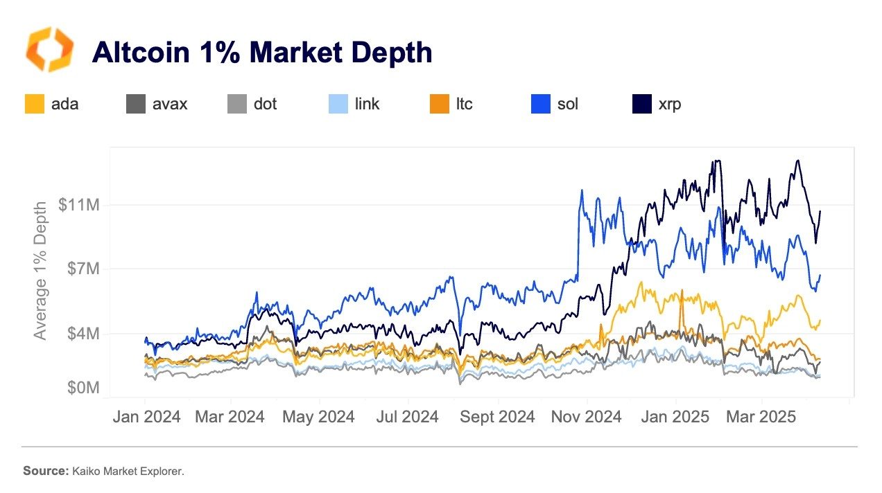 Kaiko’s data shows that XRP leads all other altcoins with 10 active spot ETF filings, followed by Solana, Litecoin, and Dogecoin. Its average 1% market depth – a measure of liquidity – is the highest among altcoins, which is vital for building efficient ETF structures. Analysts argue that this positions XRP well ahead in the regulatory queue for XRP ETF approval.