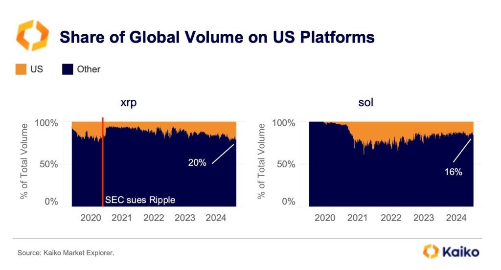 This legal clarity has led to a rebound in XRP trading on U.S. exchanges, with its spot volume reaching the highest levels since the lawsuit began in 2021. In contrast, Solana – a major contender in the altcoin ETF race – has seen its U.S. market share shrink to just 16%, down from 25–30% in 2022.
