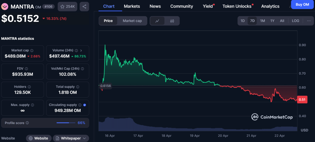 Still, OM tokens remain under pressure, trading at around $0.51, down 17% over the past week and over 90% from last month’s peak. While the MANTRA OM Tokens burn initiative has been welcomed by the community, sustained recovery will depend on execution, transparency, and rebuilding trust through consistent delivery.