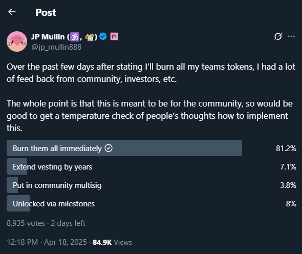 On-chain proof of the process is available via public wallet addresses, offering full transparency. The community overwhelmingly backed the burn via a social media poll, with 81% supporting immediate action.