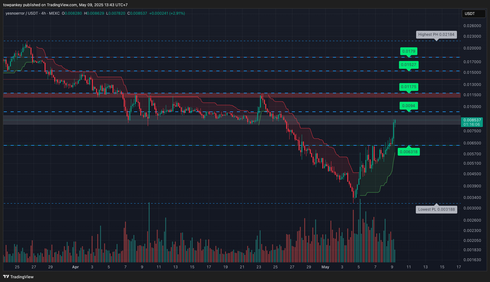 The pair recently reversed from a downtrend, forming a strong V-shaped recovery from the 0.0031 support. Price just broke past a resistance at 0.0063 and is now testing the 0.0085–0.0094 supply zone.