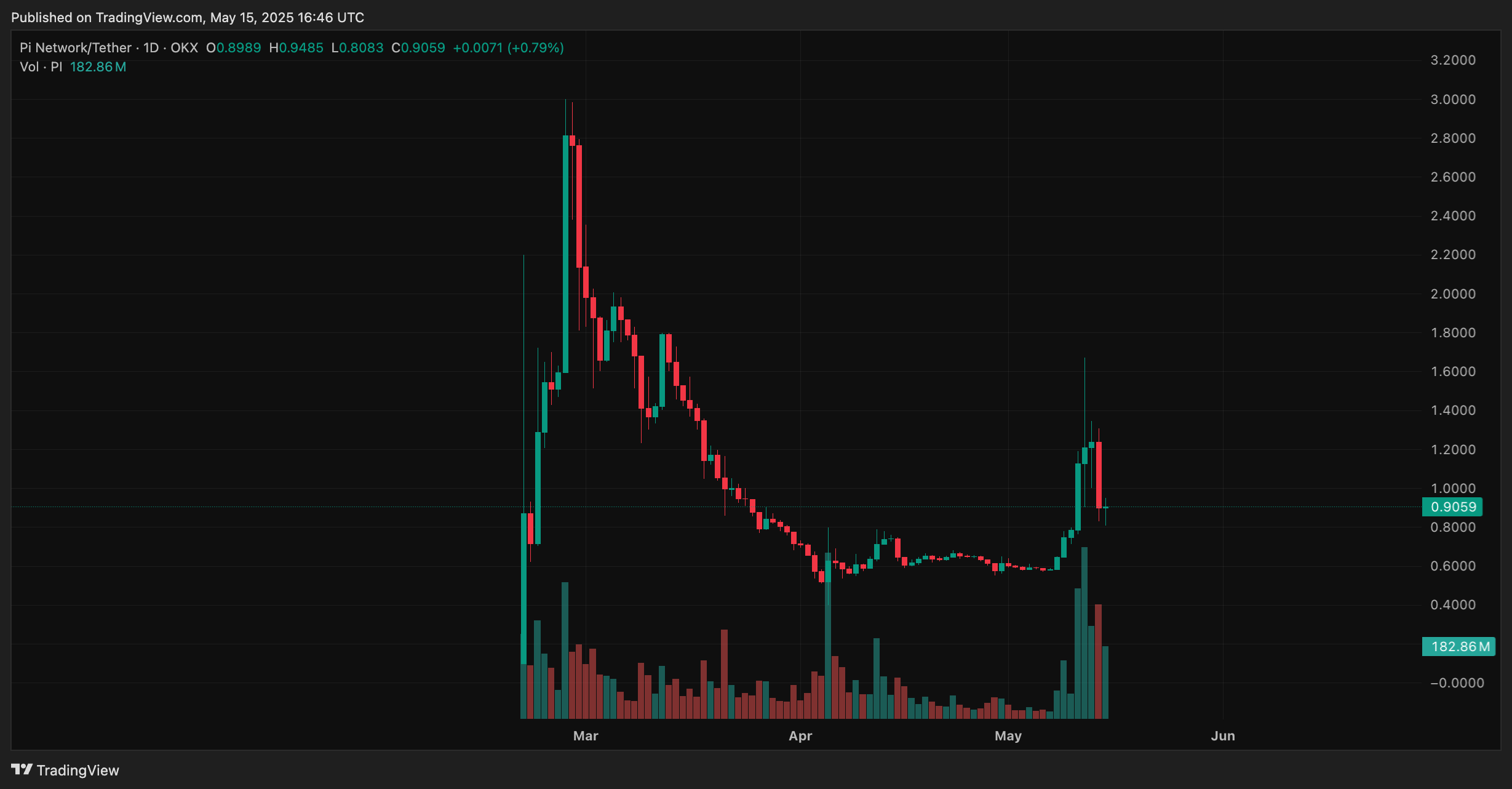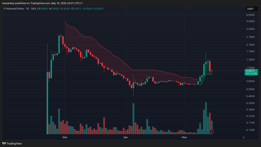 Pi surges 43.42% weekly, now testing $0.90 support after a $1.70 peak.