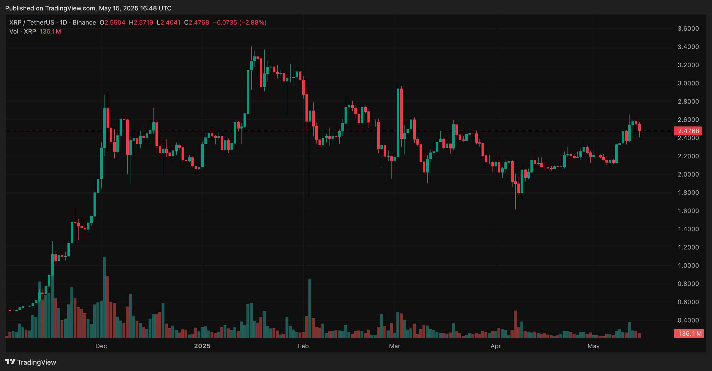 XRP trades at $2.49 with a 10.59% weekly gain, and eyes a $3.00 breakout.