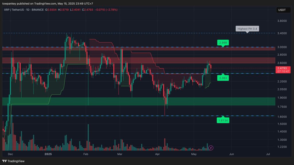 XRP faces strong resistance near $3.00. Despite mixed indicators, it remains bullish overall, but may range between $2.36–$2.80 without fresh volume.