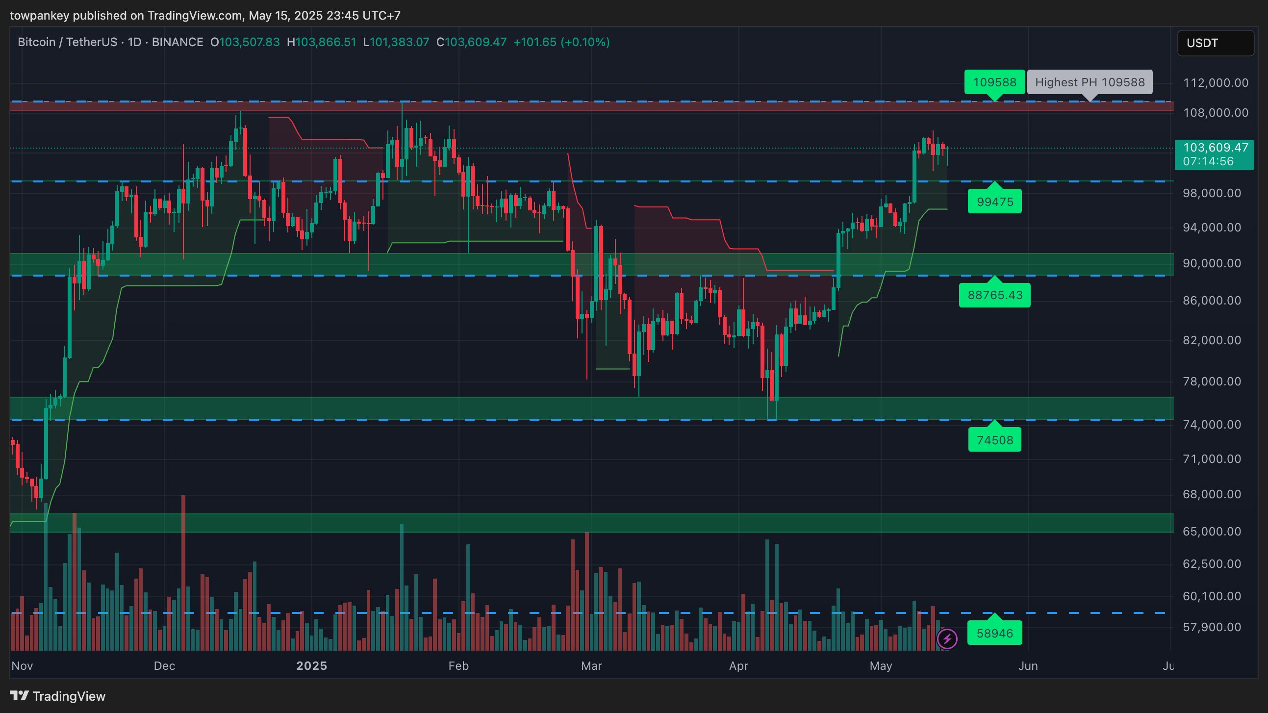 - Bullish: If price breaks $109,588 with strong volume, expect a rally toward $115,000–$118,000 psychological levels.