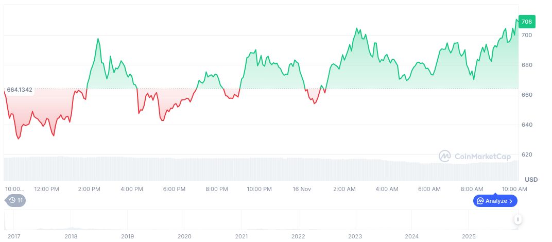 Zcash (ZEC) is currently priced at $735.01, with a market cap of approximately $11.99 billion. The asset has experienced remarkable growth, indicated by a 24-hour price change of 12.61% and a 30-day rise of 234.32%. CoinMarketCap notes a substantial 1928.14% increase over a 90-day period, highlighting its strong market performance.