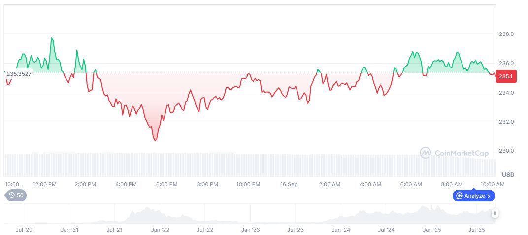 Solana’s current market metrics, as of September 16, 2025, reflect significant growth. Priced at $237.47, Solana holds a market cap of $128.95 billion. Recent changes show a 24-hour increase of 2.06% and a 7-day rise of 9.58% according to CoinMarketCap.