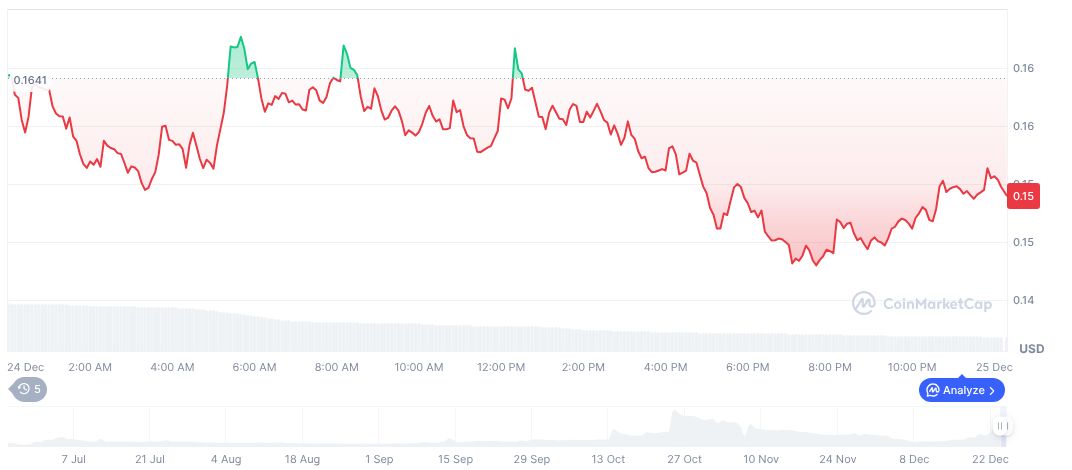 According to CoinMarketCap, the Humanity Protocol (H) is currently valued at $0.15 with a market cap of approximately $355.91 million and a decrease in its 24-hour trading volume by 68.27%. Over 90 days, it has surged by 211.57%.