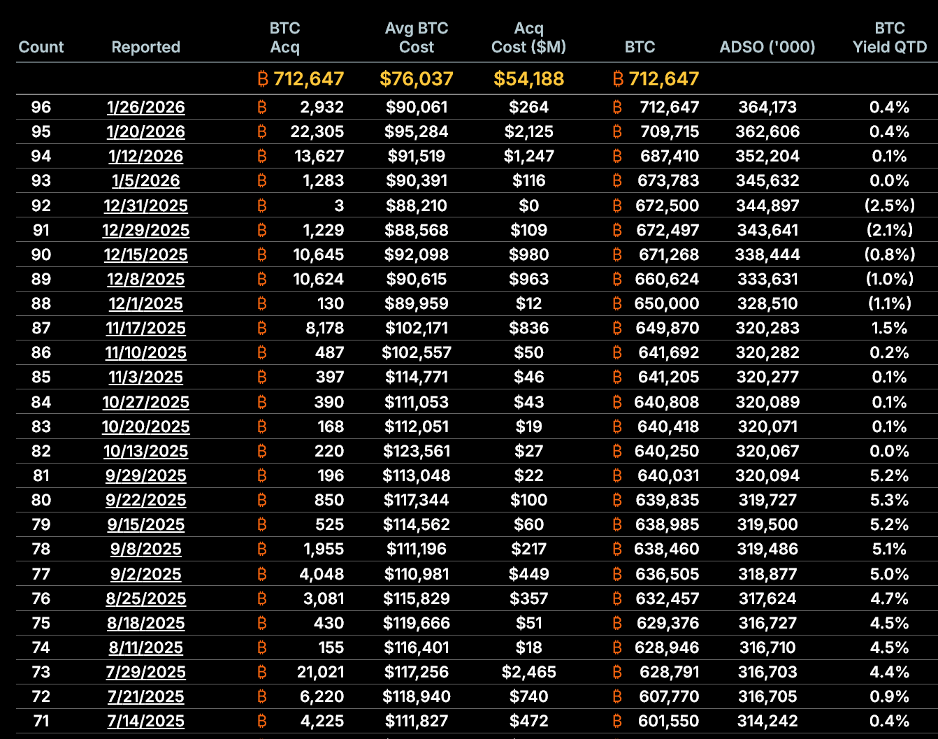 As of January 25, 2026, MicroStrategy holds 712,647 BTC, acquired for $54.19 billion at an average price of $76,037 per BTC. Its most recent purchase on January 26 added 2,932 BTC for $264.1 million, funded almost entirely through new share issuance.
