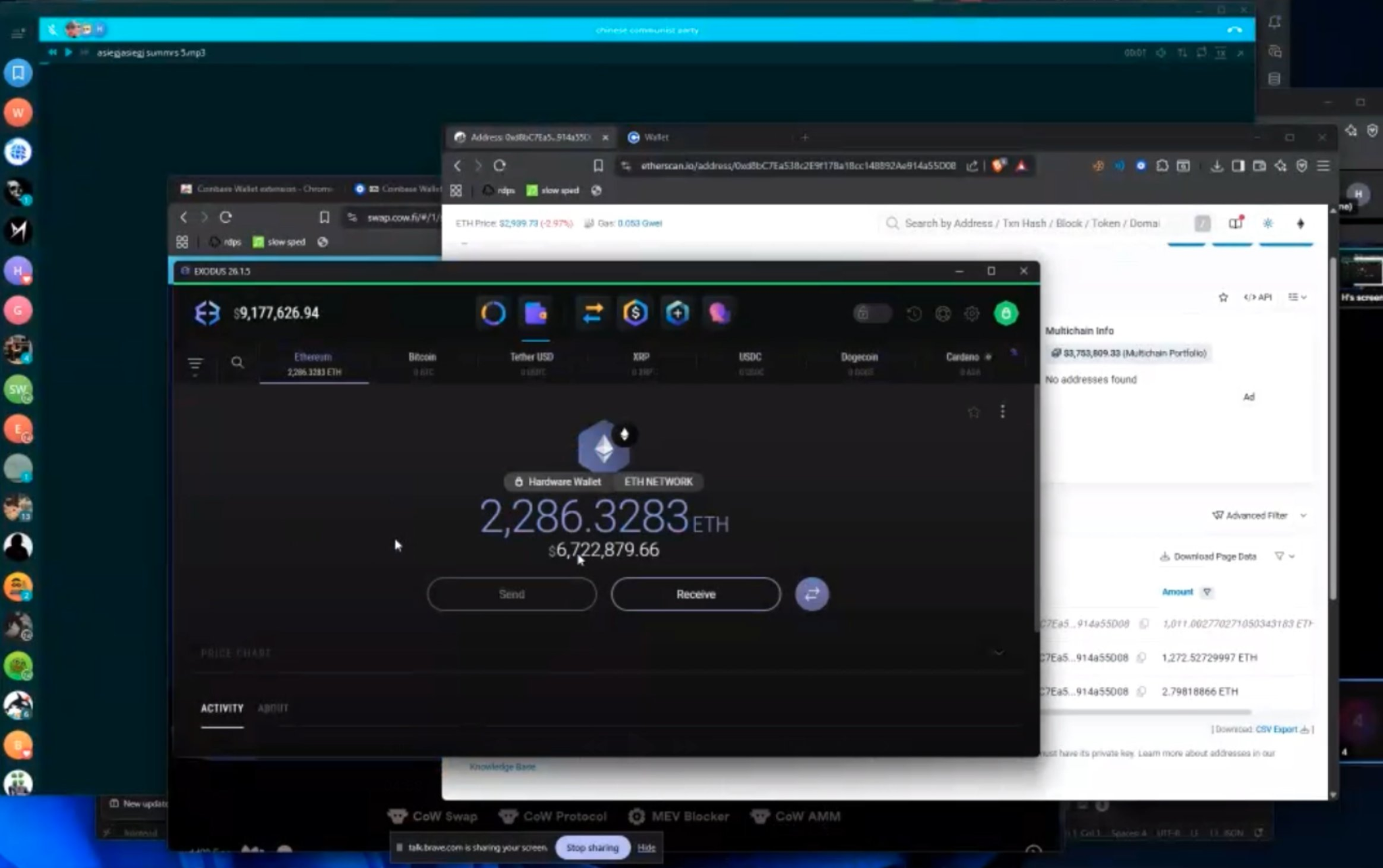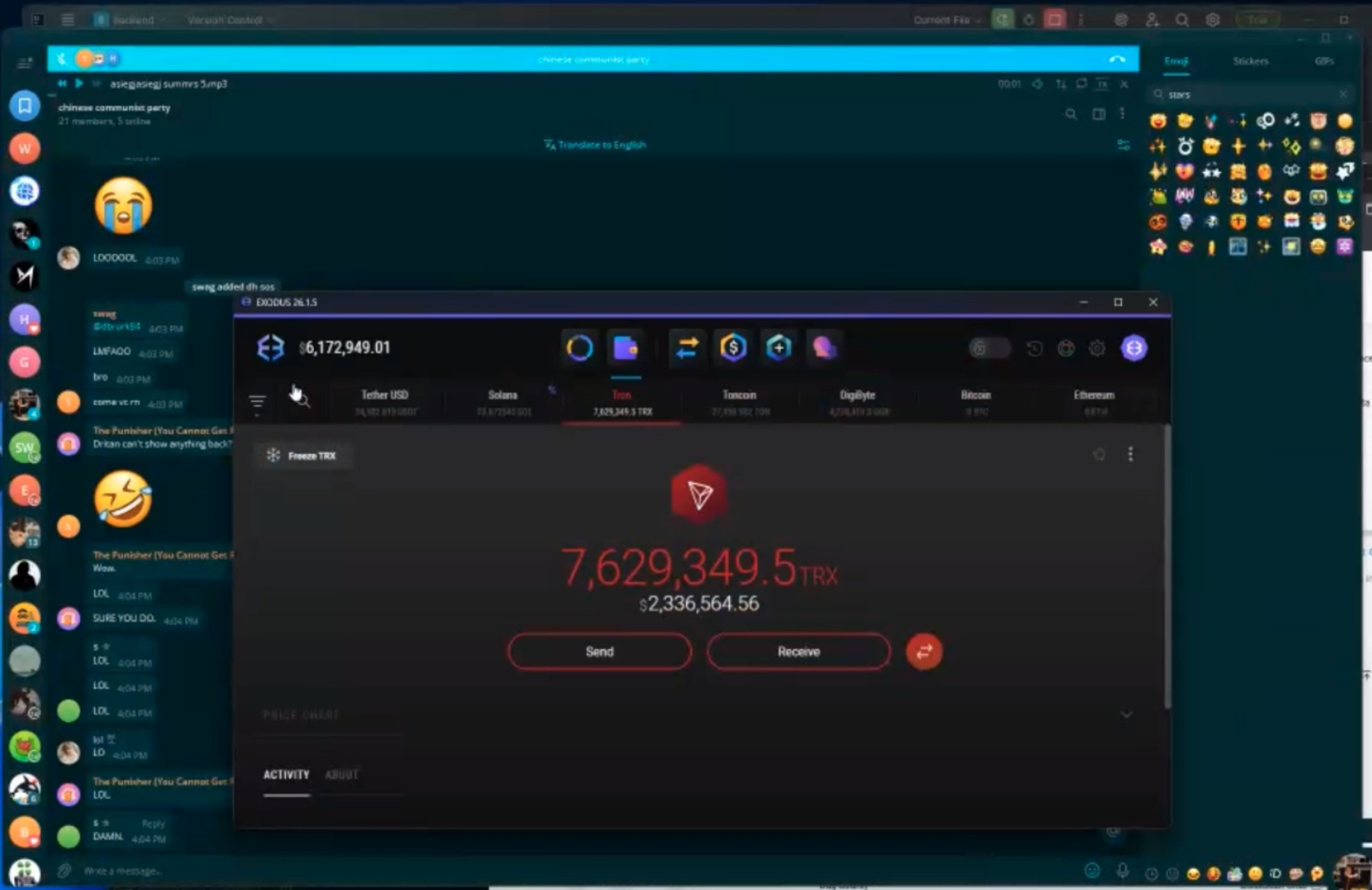 During a recorded Telegram dispute, Lick screen shared an Exodus wallet showing 2.3 million dollars in Tron and then received a live transfer of about 6.7 million dollars in ETH, after which around 23 million dollars was consolidated into one wallet.
