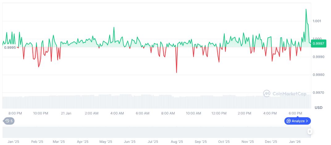 Ripple USD (RLUSD) currently trades at $1.00, holding a market cap of approximately 1.34 billion. It shows a 24-hour trading volume fluctuation of 19.76%, governed by data from CoinMarketCap. Historically nominal changes include: 24-hours: -0.01%, and 30-days: 0.07%.