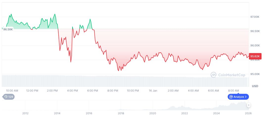 As of the latest data, Bitcoin, under the symbol BTC, is trading at $95,352.01, with a market cap of $1.90 trillion and market dominance at 59.00%, according to CoinMarketCap. The cryptocurrency’s 24-hour trading volume is $45.35 billion, marking a 23.56% decrease. Over 90 days, Bitcoin’s price has dropped 10.91%, yet it shows resilience with a 5.45% increase over the past week.