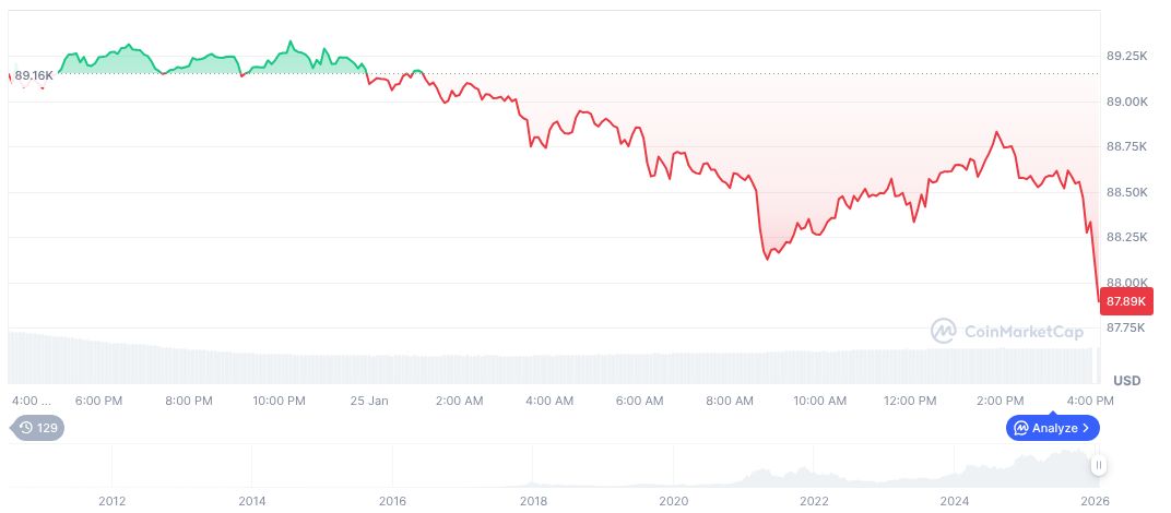 Bitcoin (BTC) currently trades at $87,877.83, with a market cap of $1.76 trillion and dominance at 59.07%, according to CoinMarketCap. The circulating supply is 19.98 million BTC of the 21 million maximum. Over the past day, BTC has fallen 0.89%, with notable declines of 23.63% over 90 days and a volume spike of 169.26%.