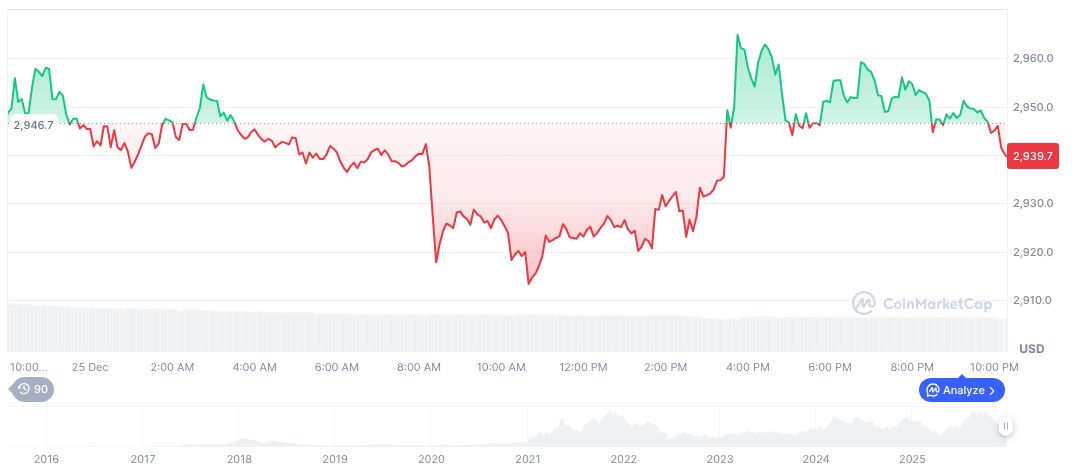Ethereum (ETH), as of 17:06 UTC on December 26, 2025, stands at $2,913.40 with a 24-hour trading volume of $19.49 billion. The last 90 days saw a steep decline of 27.21%. Data source: CoinMarketCap.