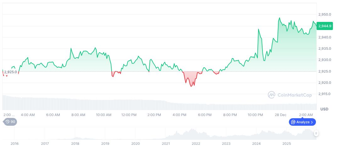 Ethereum (ETH) is valued at $2,939.63, recording a 24-hour trading volume of $7.52 billion with a slight growth of 0.31%. The cryptocurrency’s market cap stands at $354.80 billion with a market dominance of 11.93%, as per CoinMarketCap data dated December 28, 2025. However, in the past ninety days, ETH has experienced a decline of 28.90%.