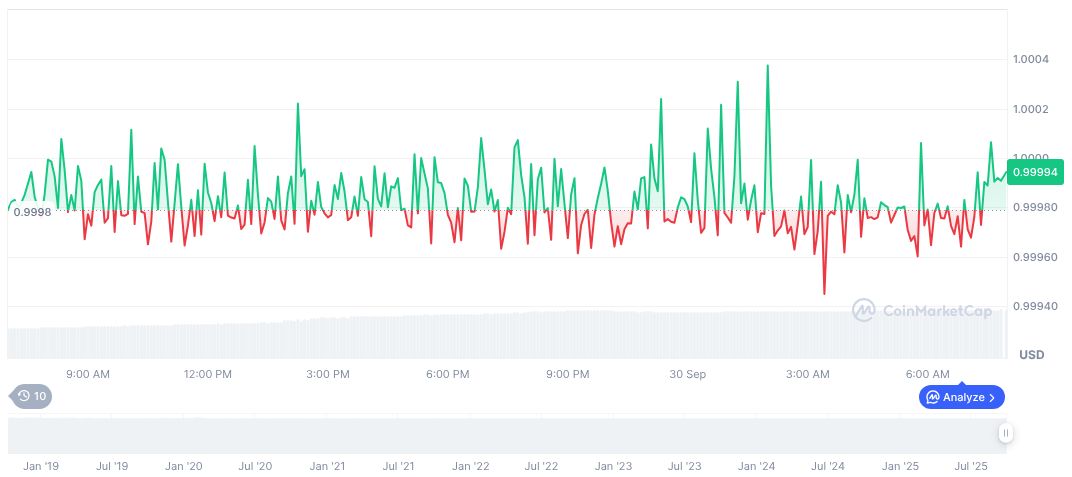 USDC continues to hold its value at $1.00, with a market cap of 73.56 billion and is ranked with a 1.90% market dominance. CoinMarketCap data from September 30, 2025, shows a 24-hour trading volume of 15.60 billion, displaying a volatility of 8.52%. Price changes were minimal over the past 90 days.