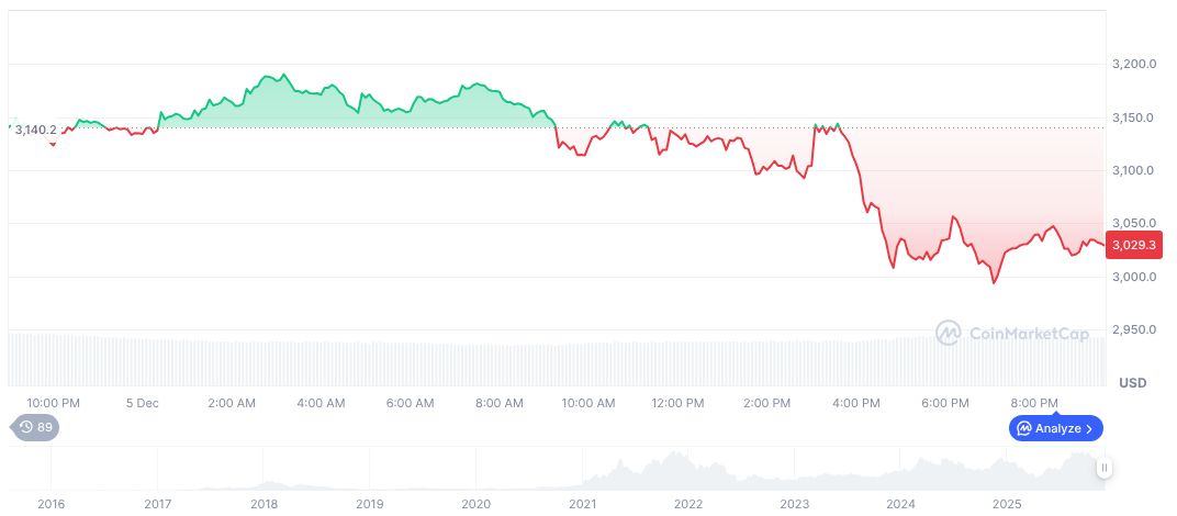 Ethereum (ETH) currently trades at $3,030.68, with a market cap of approximately 365.79 billion USD, capturing 12.02% of the crypto market share. Though its trading volume hit 28.20 billion USD today, a decline of 5.55% was noted, signaling a volatile environment. Over the last quarter, the value of ETH has decreased by 35.36%, as reported by CoinMarketCap.