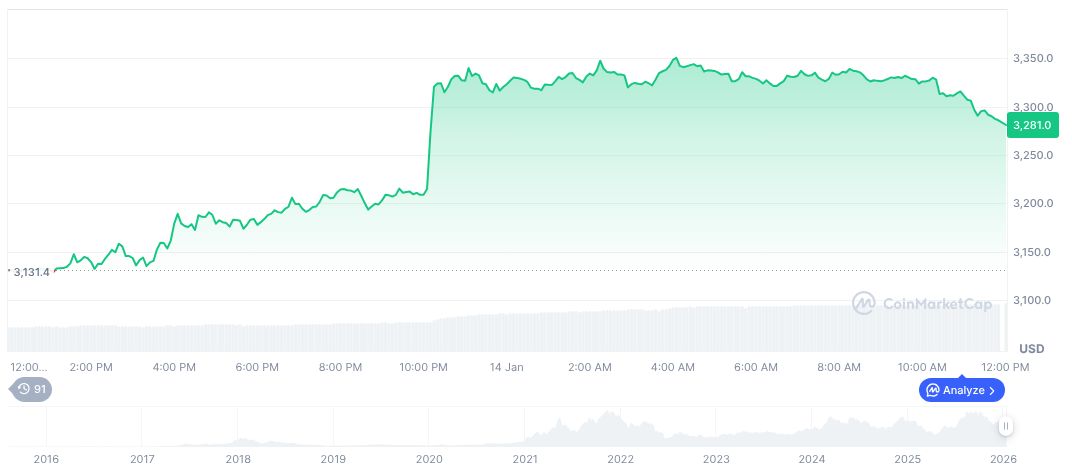 As reported by CoinMarketCap, Ethereum currently trades at $3,325.68 with a market cap of $401.39 billion and a 24-hour trading volume change of 8.92%. Despite a recent 0.22% price dip in 24 hours, Ethereum has gained 4.77% over seven days.
