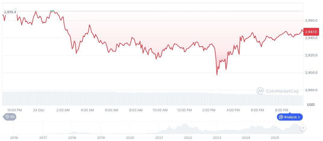 As of December 25, 2025, Ethereum’s market cap stands at $355.52 billion, while its price hovers around $2,945.62, according to CoinMarketCap. The 24-hour trading volume experiences a drop of 35.25%, yet Ethereum dominates 11.99% of the cryptocurrency market. Despite recent downturns over the past three months, Ethereum has seen a slight recovery of 3.74% in the last week.