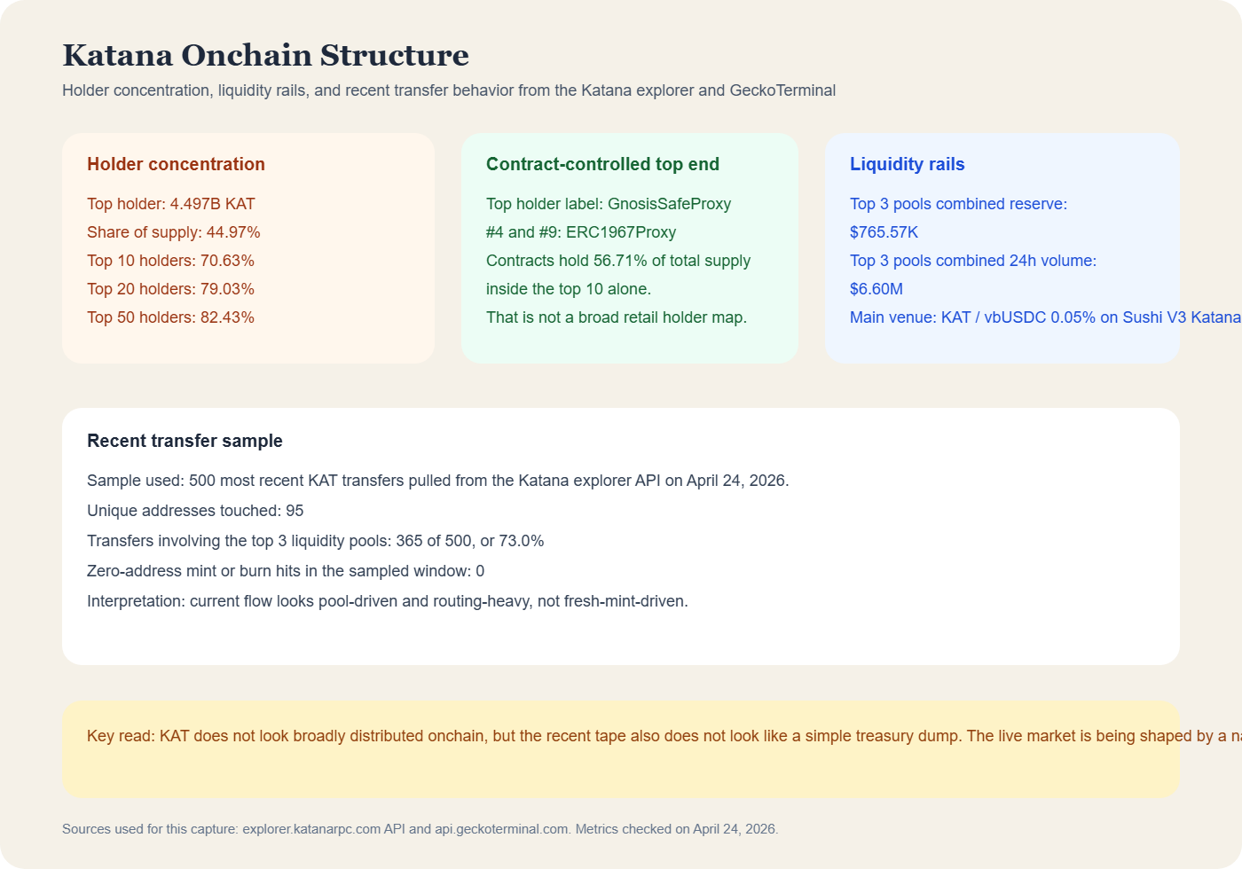 Katana Network (KAT) is moving higher because the market is repricing a small-cap token attached to a much larger chain footprint, while on-chain supply still looks heavily concentrated inside safes, proxies, and other managed addresses rather than broadly distributed across a deep free float. As of April 24, 2026, the CoinGecko KAT page showed KAT near $0.01579, up 55% in 24 hours, with about $434.85 million in 24-hour volume against a market cap of roughly $37.01 million.