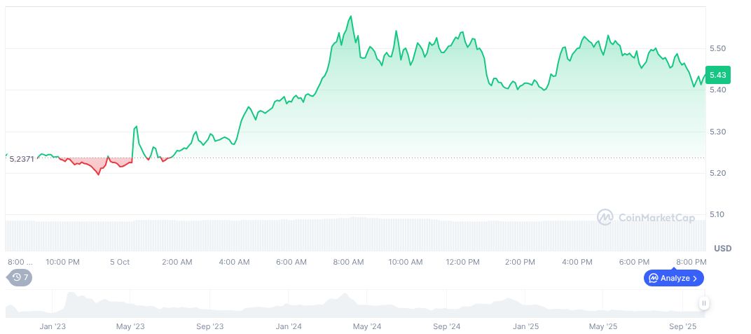 According to CoinMarketCap, Aptos (APT) is priced at $5.42 with a market cap of $3.82 billion. Its 24-hour trading volume has reached $474.50 million, marking a 2.61% change. APT shows a 29.88% price increase over the last week, demonstrating robust growth since the ETF filing.