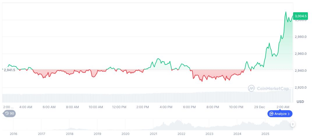 According to data from CoinMarketCap, Ethereum (ETH) has a market cap of $353.93 billion and a 24-hour trading volume of $27.26 billion, with a minor price change of 0.03% over the last 24 hours as of December 29, 2025.