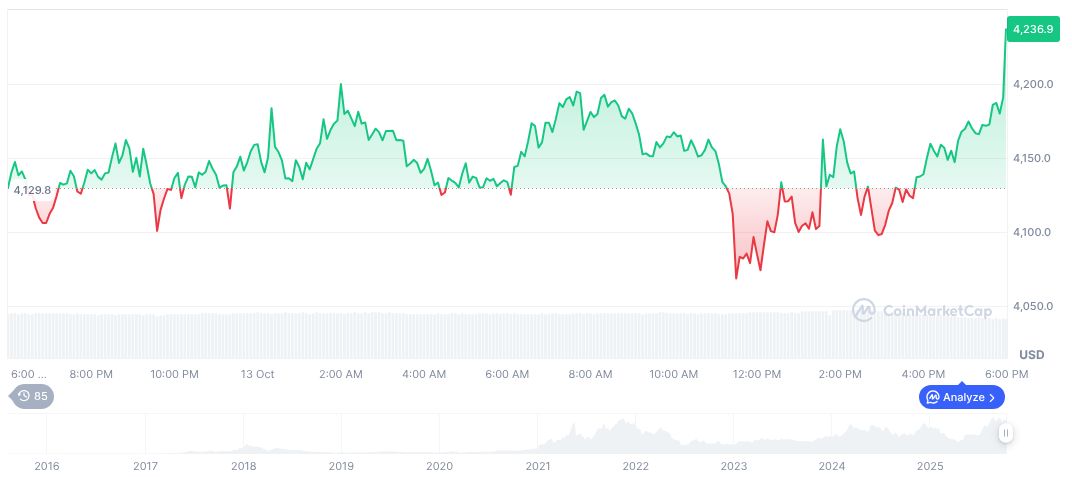 Ethereum (ETH) currently trades at $3,953.56, boasting a robust market capitalization of $477.19 billion. Data from CoinMarketCap reveals a trading volume of $58.1 billion over the last 24 hours, marking a 3.82% decrease. Over 90 days, Ethereum’s price increased by 24.80%, contrasting a 16.32% drop over the past week.