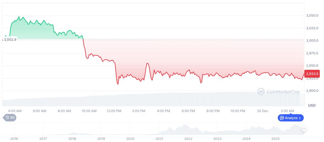 As of December 30, 2025, according to CoinMarketCap, Ethereum’s current price stands at $2,967.24, boasting a market cap of $358.13 billion and a market dominance of 11.98%. Ethereum’s 90-day price change reflects a decrease of 31.63%, highlighting recent market challenges.