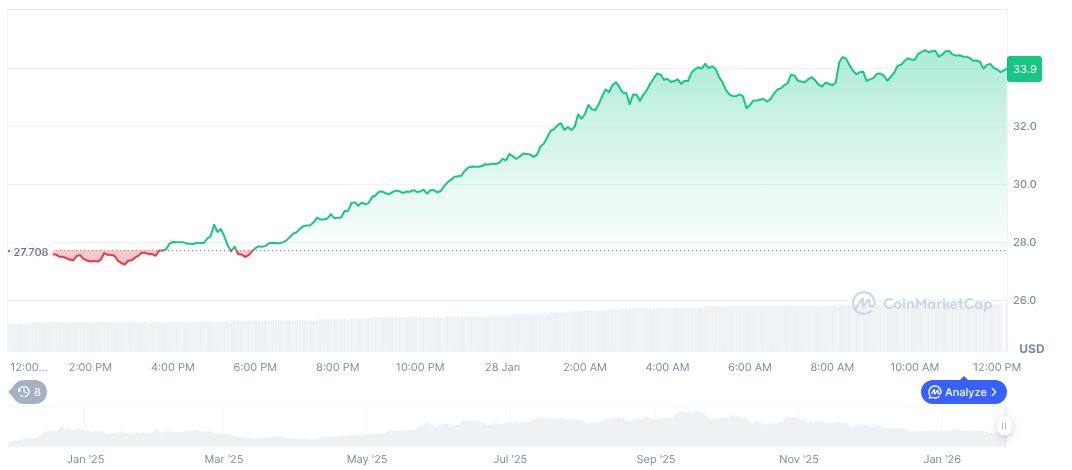 Hyperliquid’s approximate metrics include a current price of $33.84 and a market capitalization of $10.22 billion. Within 24 hours, its value surged by 22.36%, driven by increased trading volumes reaching $862.19 million. These fluctuations offer a picture of heightened market interest and volatility, as evidenced by a 64.70% rise in the past week.