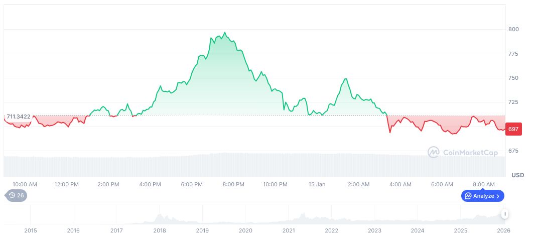 Monero’s current trading data shows a price of $697.06 with a 24-hour volume at $486.19 million, indicating a -1.14% change. The recent rise over 90 days totals 141.61%, as per CoinMarketCap.