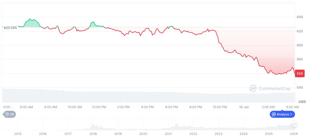 Monero (XMR) is currently priced at $564.48 with a market cap of $10.41 billion. Its 24-hour trading volume is $232.27 million, a drop of 27.68%. Despite this, XMR has gained 16.82% over the last week, according to CoinMarketCap.