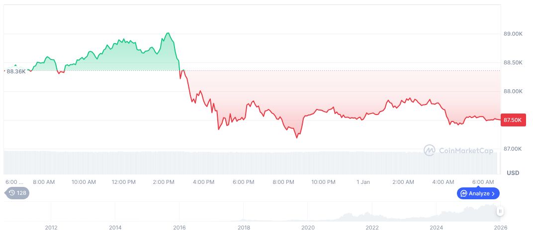 Bitcoin (BTC) is trading at $87,814.49 with a market capitalization of $1.75 trillion. The circulating supply stands at 19,970,118 with a maximum cap of 21,000,000. Over the past 90 days, BTC has seen a 28.68% price reduction, and a 24-hour trading volume decreased by 28.62% to $23.64 billion, according to CoinMarketCap.