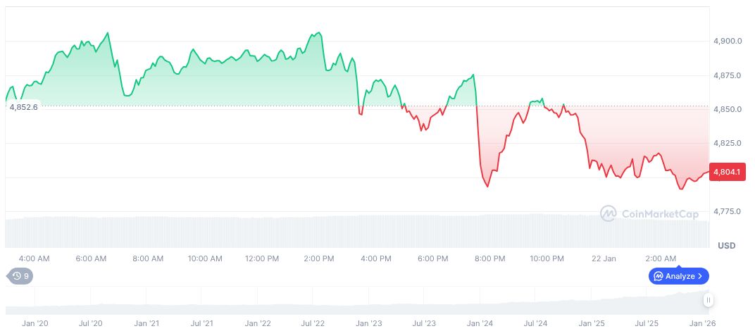 Based on CoinMarketCap data, PAX Gold (PAXG) is currently priced at $4,803.85, with a market cap of $1.89 billion. The 24-hour trading volume reached $495.07 million, a decrease of 12.67%. PAXG has a circulating supply of 392,485.07 tokens.