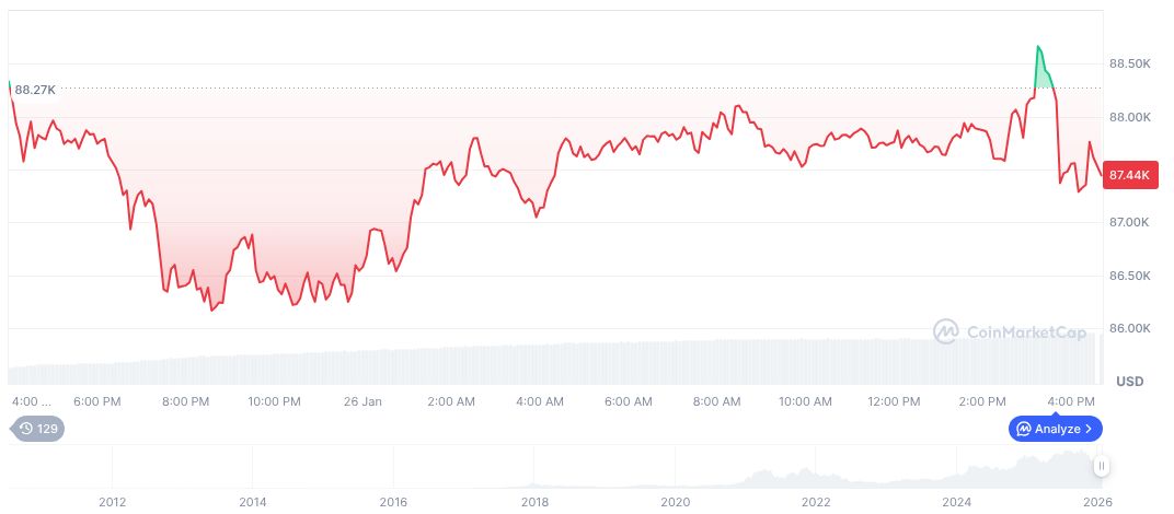 As of January 27, 2026, Bitcoin (BTC) is valued at $88,123.39, positioning itself prominently with a market cap of 1,760,789,747,548, representing 59.12% dominance. According to CoinMarketCap, its trading volume experienced a 16.91% shift with 24-hour growth marked at 1.06%, reflecting resilient investor confidence amidst ongoing fluctuations in the past 90 days.