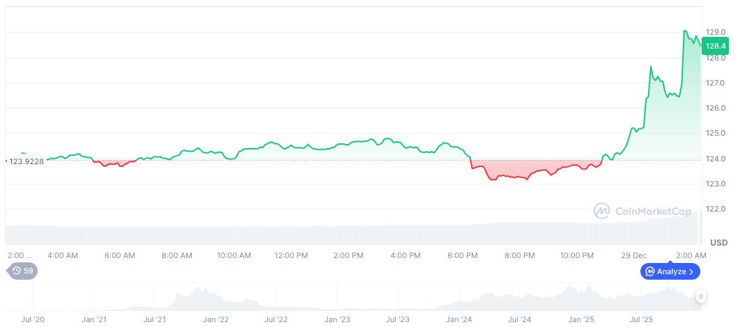 According to CoinMarketCap, Solana’s (SOL) current market performance reflects its solid position, with the price at $127.98. The market cap is $72.03 billion, representing 2.37% market dominance. Despite a 38.98% decline over the last 90 days, there is a 3.39% increase in the last 24 hours.