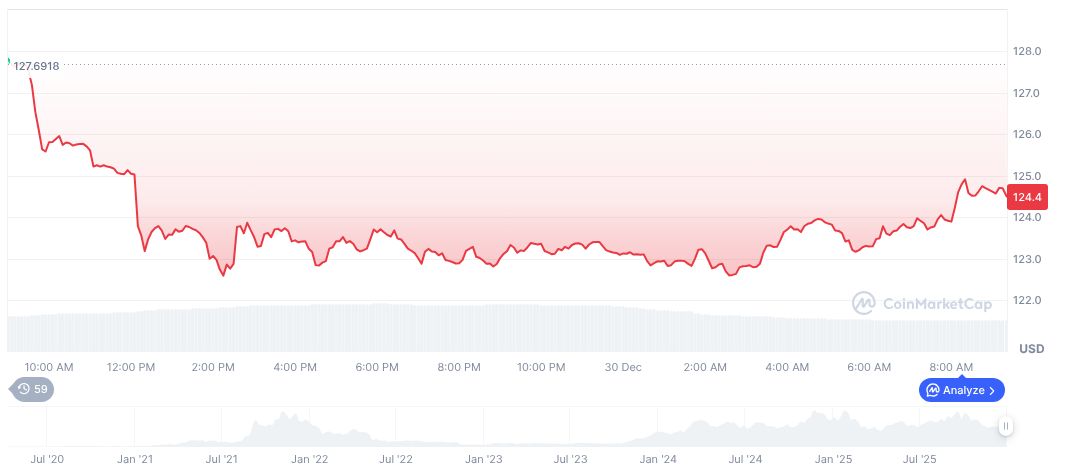 Per CoinMarketCap, Solana (SOL) presently trades at $124.58, holding a market cap of approximately $70.13 billion. The 24-hour trading volume dropped by 11.77%, currently at $3.39 billion, with prices showing a 42.47% decline over the past 90 days.