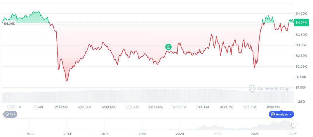 According to CoinMarketCap, Bitcoin’s current price is $83,980.25, with a market cap of 1.678 trillion dollars, showing a 0.34% price drop in the last 24 hours. Its trading volume remains high at 72.668 billion dollars over the same period, indicating sustained activity in the market despite recent volatility.