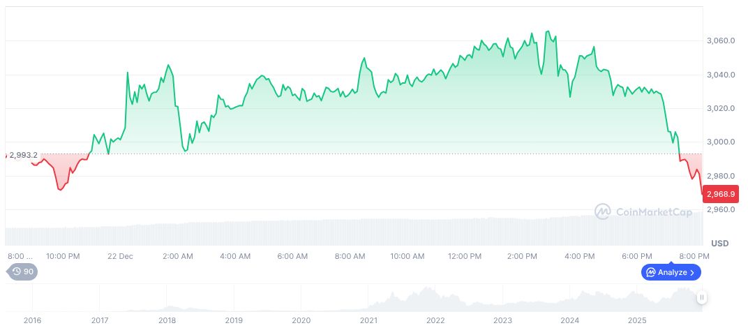 Ethereum, trading at $2,996.20, holds a market cap of $361.63 billion and dominates 12.12% of the market. Over the past 24 hours, its trading volume reached $19.20 billion, despite a 0.82% price drop. Following mixed performance across short-term and long-term price changes, Ethereum remains a key player in the digital currency landscape.